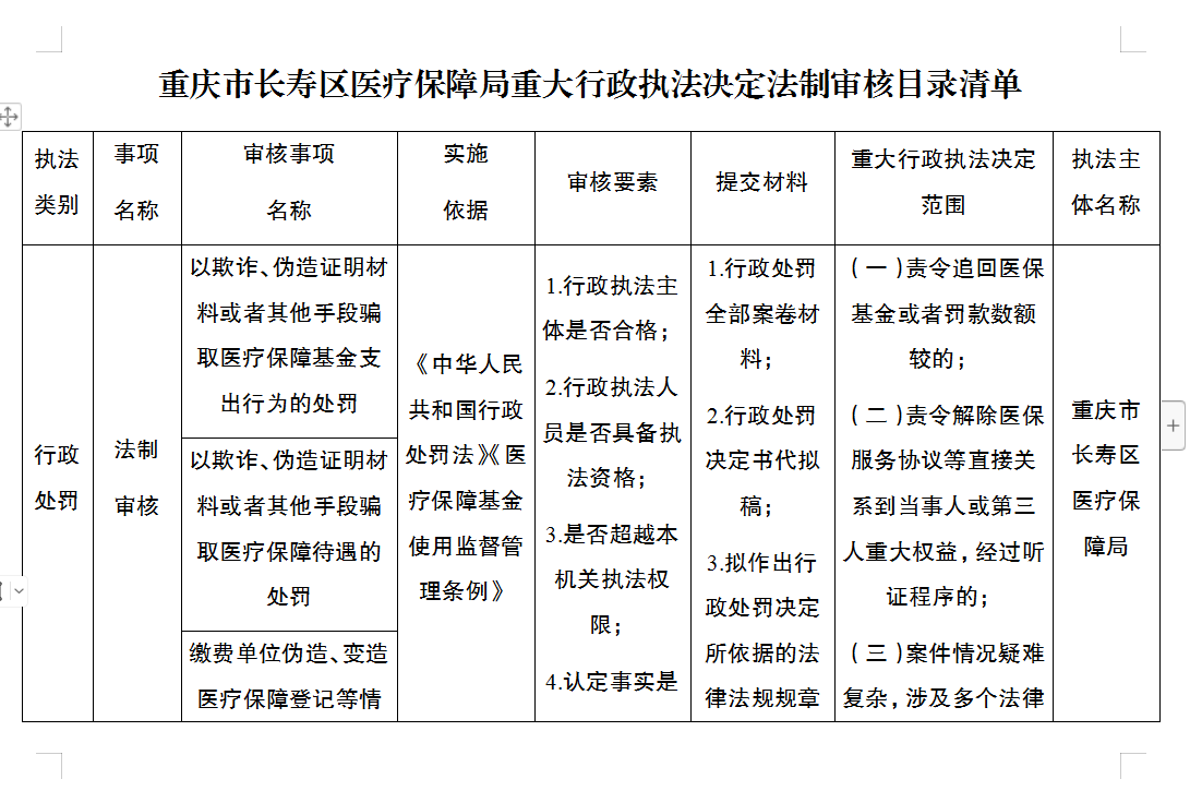 重慶市長(zhǎng)壽區(qū)醫(yī)療保障局重大行政執(zhí)法決定法制審核目錄清單